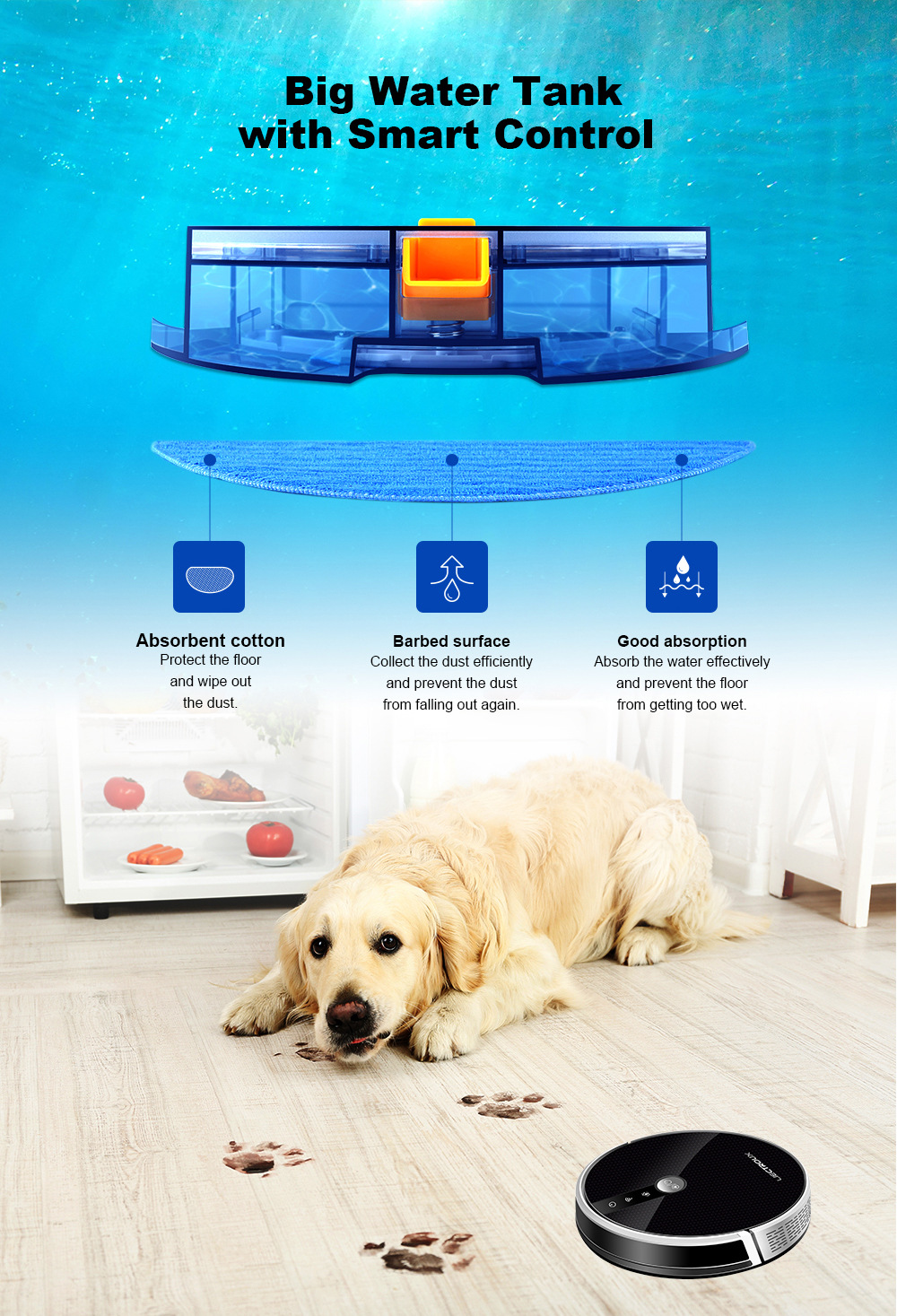 6. Le réservoir d'eau de commande électrique assure une infiltration d'eau uniforme. L'infiltration d'eau s'arrête automatiquement si le robot cesse de fonctionner. L'énorme volume d'eau de 350 ml garantit un nettoyage continu et humide jusqu'à 100 minutes.